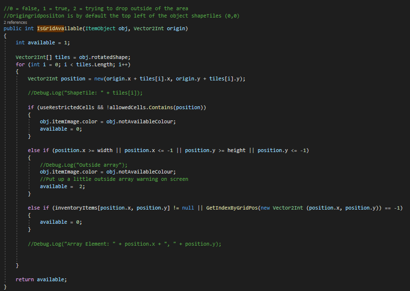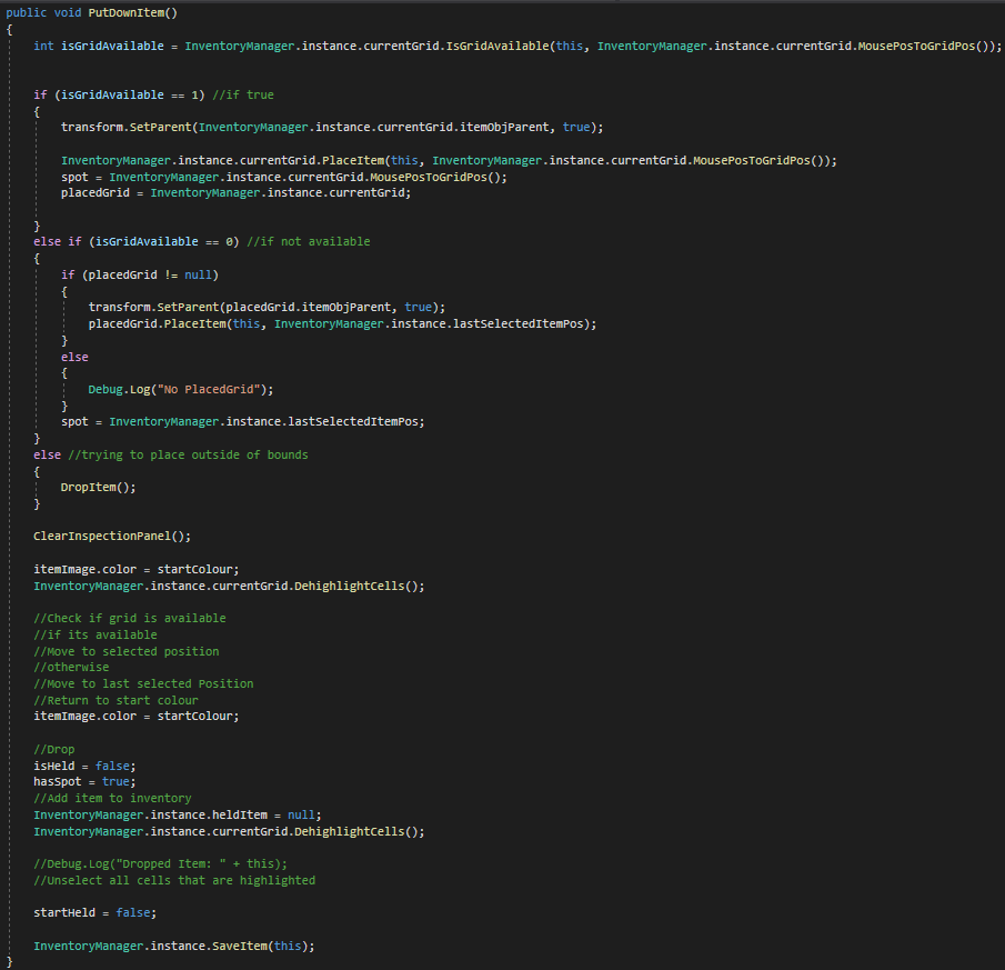 Once an item is picked up and moved across the inventory, the system must determine how it behaves when the player attempts to place it back into a grid or drop it entirely. This ensures both tactile control and gameplay consistency, especially for multi-tile and rotated items. After checking whether a slot is valid which is covered in previous design logs, when the placement is invalid the drag and drop system then has thechoice between returning the object to its original slot or dropping the item into the game world as a GameObject instead of a UI component.