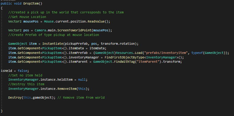 If the player attempts to place an item outside any inventory grid, it is converted into a world object, where a prefab is instantiated at the mouse position in world space ensuring that the item retains its data and appearance for consistency and then the inventory grid is updated to remove references to the dropped item.