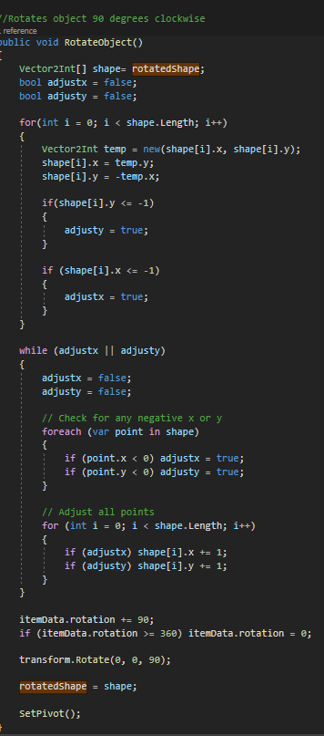 At first this really hurt my head and I had to write it out visually a couple of times to wrap my head around the logic but once it was cleared up actually applying it was really easy. I did initially want to make it so that the object could be rotated clockwise or anti clockwise but this seamed like a very limited mechanic that wouldn't be utilised too often so I kept it as is. Adjusting the shape tiles ensures that all placement checks, highlights, and grid interactions remain accurate after rotation, even for irregular multi-tile objects.