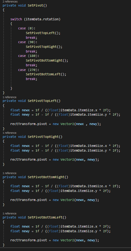 Simply rotating the visual image without adjusting its pivot point would cause items to shift incorrectly, misaligning the tiles with the grid. To counter this each 90° rotation corresponds to a specific pivot point (top-left, top-right, bottom-right, bottom-left) and then the pivot is recalculated based on the item’s width, height, and rotation state.