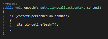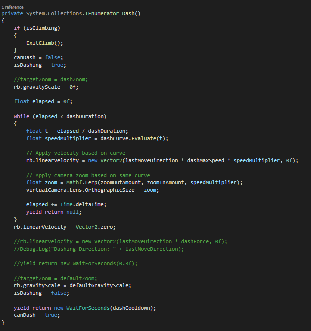 To maintain a clean horizontal burst, gravity is temporarily disabled during the dash. This prevents the player from unintentionally falling mid-dash, keeping the motion precise and predictable.