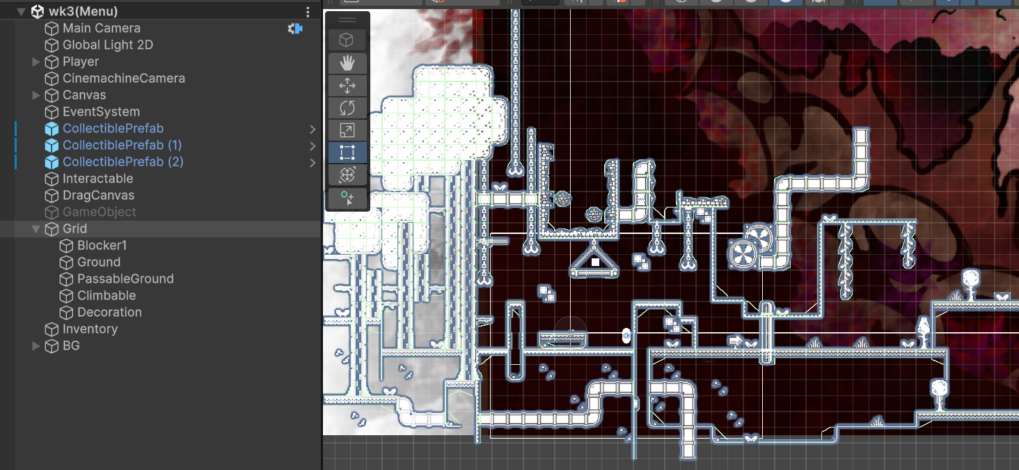 Climbable surfaces use tilemaps for precise alignment with the environment. This ensures the player can smoothly move up or down ladders without jitter or misalignment. It also allows environmental puzzles and vertical exploration to integrate seamlessly with level design.