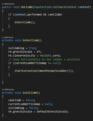 When starting a climb, the player snaps to the horizontal center of the ladder tile. This improves precision, prevents awkward sideways sliding, and visually communicates that the character is “attached” to the climbable surface. The snapping is interpolated over a short duration to feel natural rather than instantaneous.